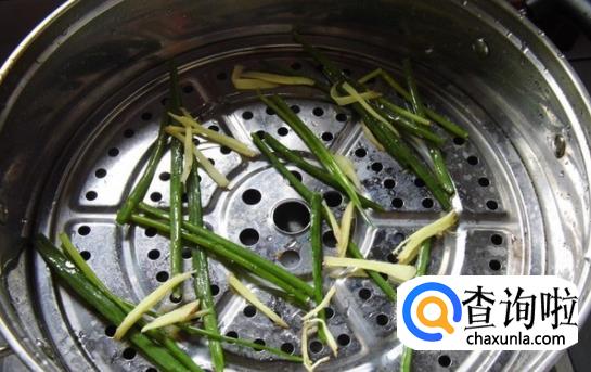 接下来我们在蒸锅中放入适量的水,在蒸阁上铺上葱段和姜丝,将大闸蟹放入,小编给大家讲的这个方法不绑住蟹腿。