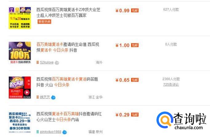 还有一种花钱快速获得复活卡的方式就是在淘宝上搜索“今日头条百万英雄复活卡”就会看到有很多的商家在售卖复活卡,就可以快速得到了。