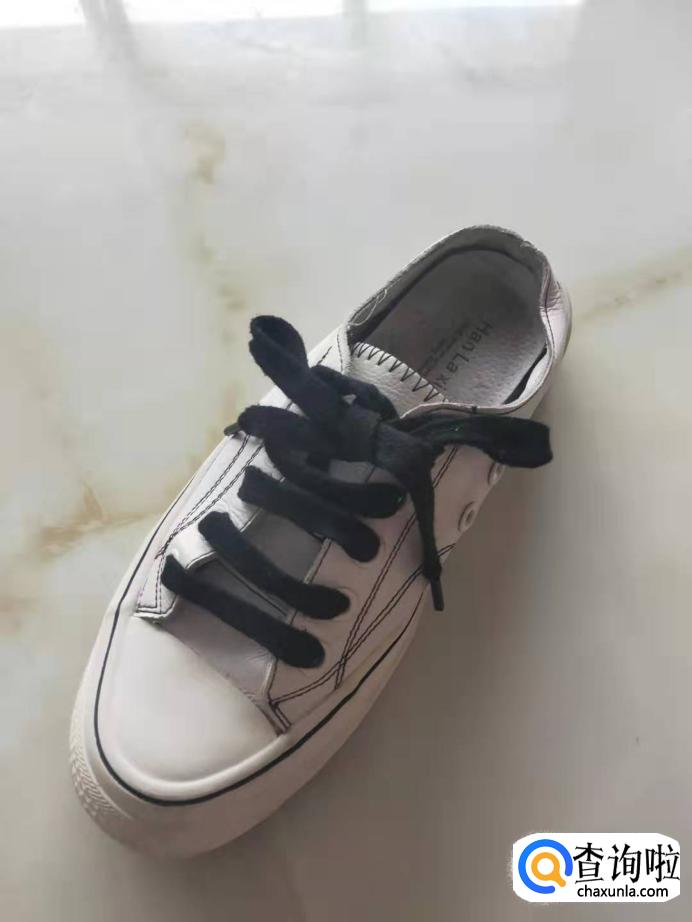 把鞋带从鞋子的左边的第一个孔穿进,拉出在传出右边的最后一个孔。