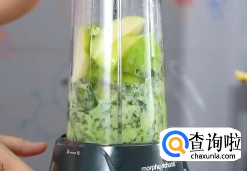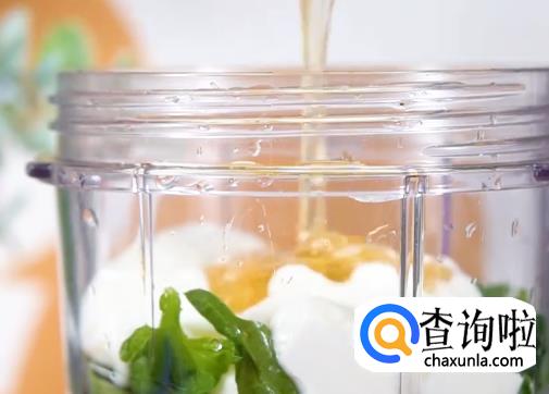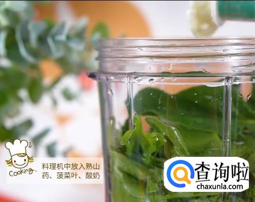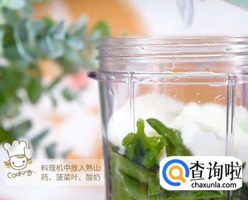 料理机中倒入泥猴桃,青苹果,熟山药,菠菜叶,酸奶,蜂蜜打成泥状。
