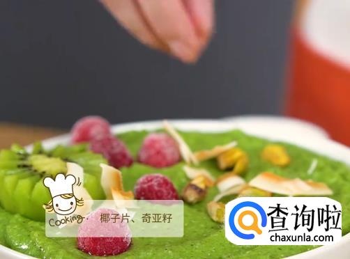 倒入碗中,摆上泥猴桃,椰子片,开心果仁,奇亚籽即可。
