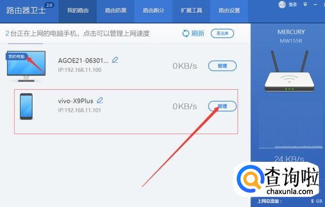打开软件,登录自己的路由器账号和密码,在路由器页面“我的路由”下面就可以看到正在使用的设备。如果是手机的话在上面会显示出手机的型号。如果是自己的电脑或者设备打开的话,在右侧就会出现我的设备或者我的电脑提示。如果发现不是自家的无线设备的话,可以点击右侧的管理进行限制或者拉入黑名单。