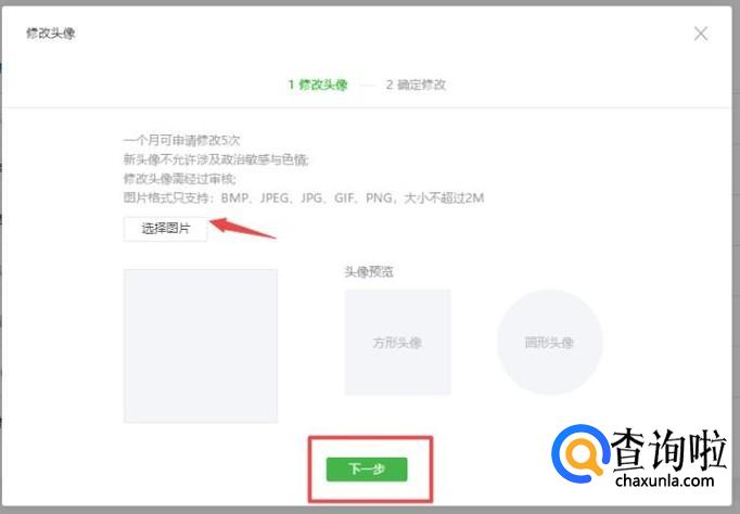 点击原来的头像,然后点击选择图片,选择你想上传的头像,然后点击下一步。