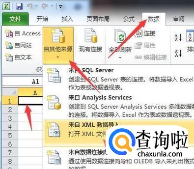 打开Excel,点击数据,点击自其他来源,来自XML数据导入。