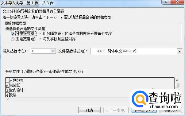 在导入对话框中选择生成文件.txt,点击打开。在导入向导中点击完成。