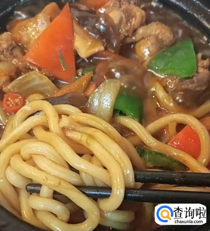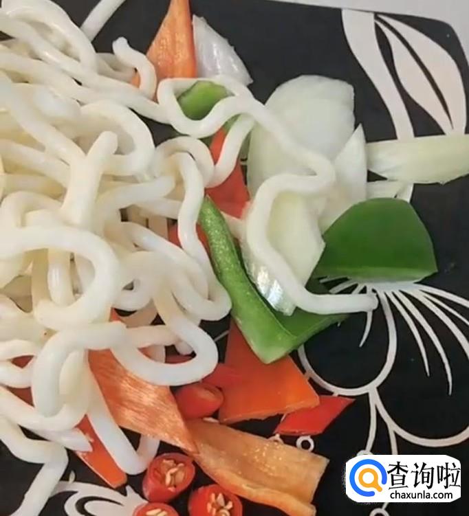加圆柱形面条和配料适量(青红菜椒,辣椒圈,青菜)。炖面条约5分钟,面条熟了,即可。