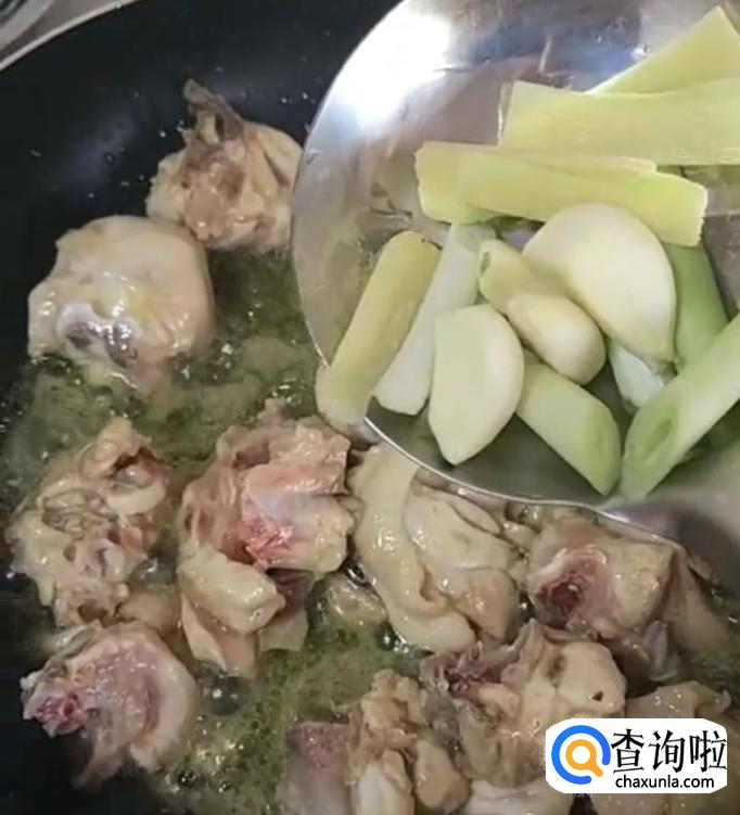 锅里放油,油温七成热的时候,放入备好的鸡块,炒熟炒香,再加入适量葱,姜,蒜爆香。