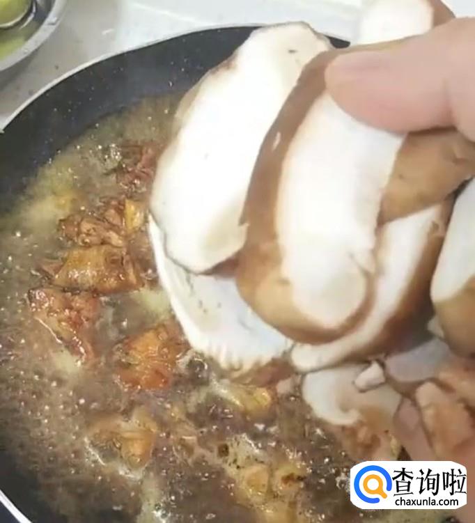 再把备好的蘑菇切成长块,放入锅中。
