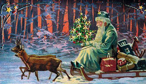 在西方国家神话传说中,圣诞老人是一位专门为好孩子在圣诞节前夜送上礼物的神秘人物。他身材丰满,拥有9只名字各不相同的驯鹿。传说每到12月24日晚上,他都会驾着由9只驯鹿拉的雪橇,挨家挨户地从烟囱进入屋里,然后偷偷把礼物放在好孩子床头的袜子里,或者堆在壁炉旁的圣诞树下。