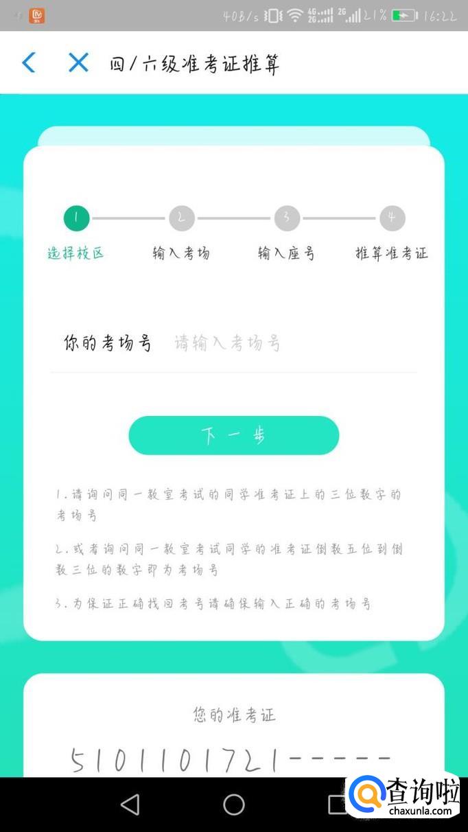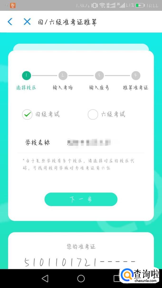 然后点击下一步,你可以询问你的室友,根据他们推算你的准考证号。