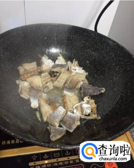 然后我们就可以开始煎干咸鱼了。把火打开热锅,接着倒入食用油,等到锅中的油开了以后,就把切好的干咸鱼倒入锅中,翻炒每一面。