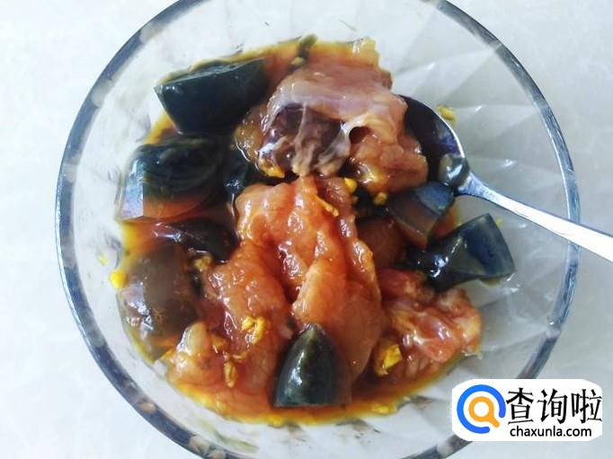 放腌好的瘦肉、皮蛋进去。