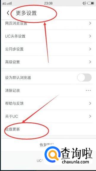 在【更多设置】中找到【检查更新】并点击它,然后对浏览器进行更新即可,如下图所示: