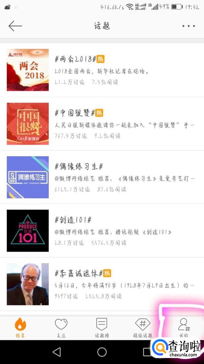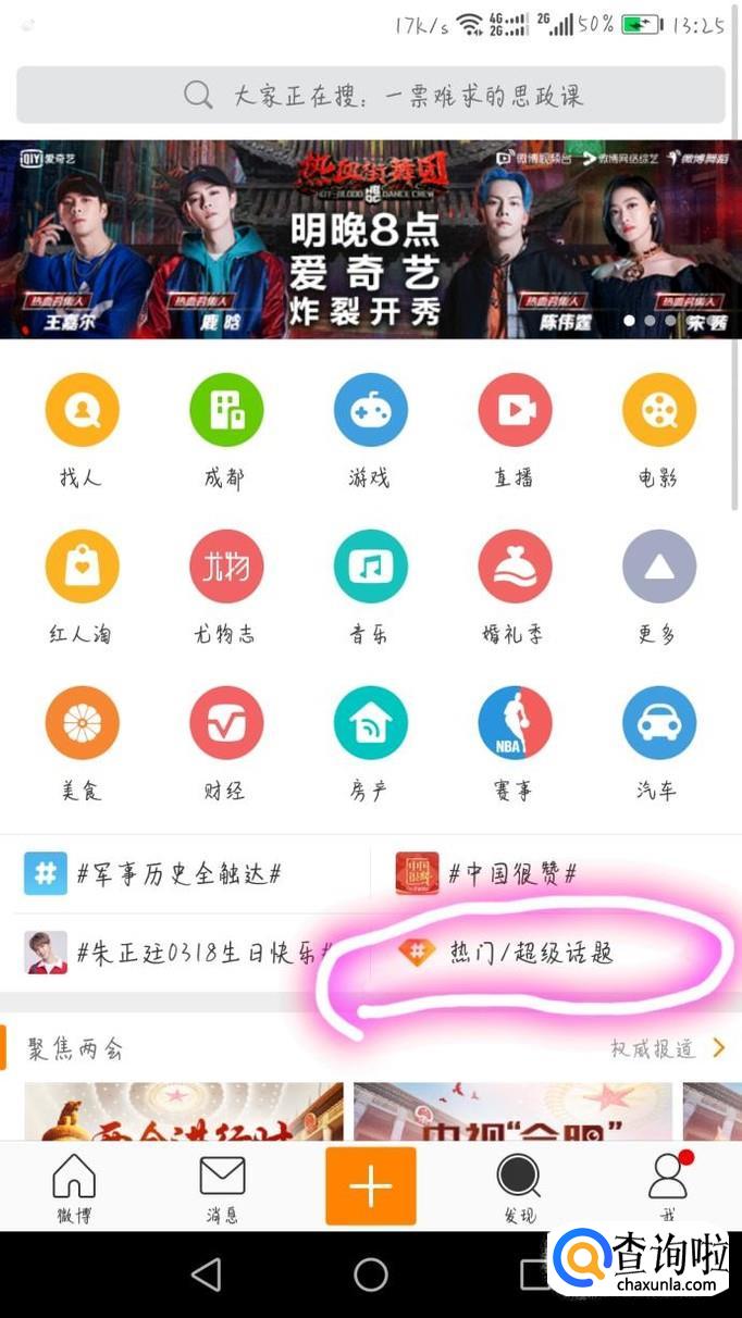 在微博的发现首页,可以看见话题,点进去,如图。