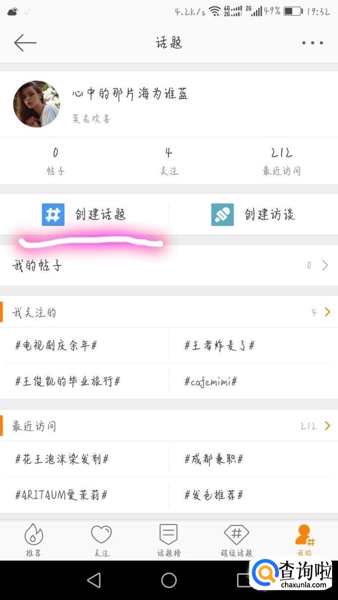 在话题这个页面的右下角有一个我的话题,点进去。