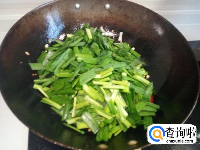 韭菜炒至颜色变绿,刚发亮光,立即关火,放入味精,出勺。