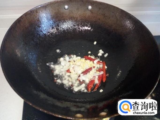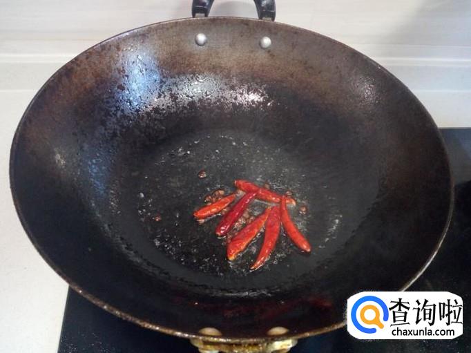 锅内放入油加热,油热后放入花椒,红干椒爆香,再放入葱,姜,蒜,翻炒。
