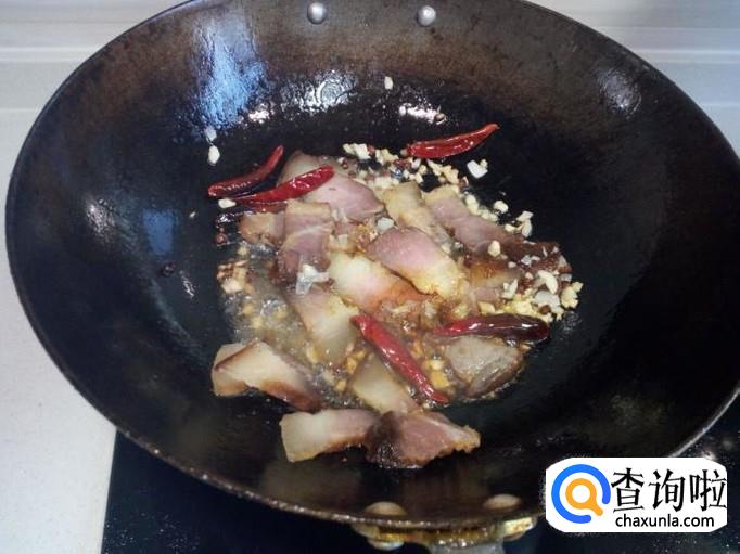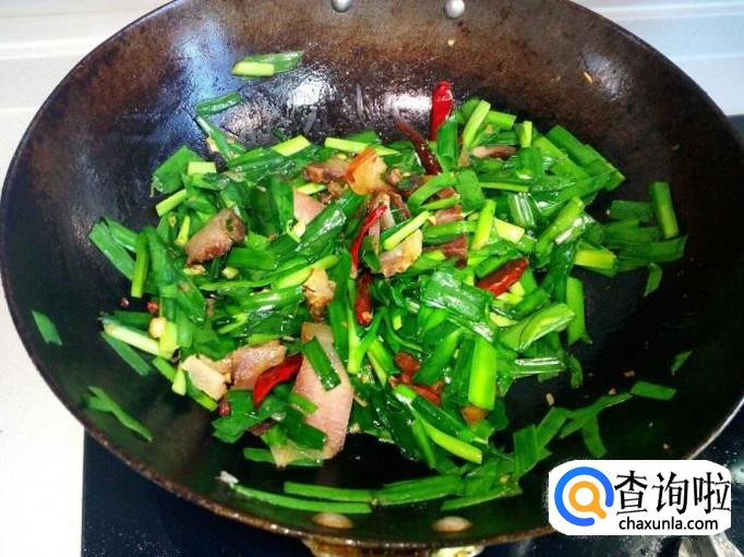 炒至腊肉透明,放入韭菜大火爆炒,放入少量盐。