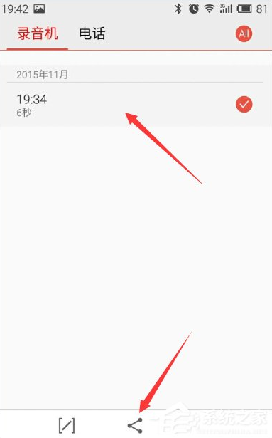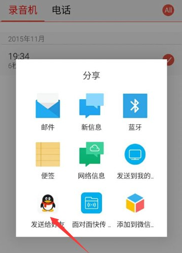 2、进行长按该录音的文件,就会在底部的位置弹出了一个三个的按钮,进行点击分享的选项。