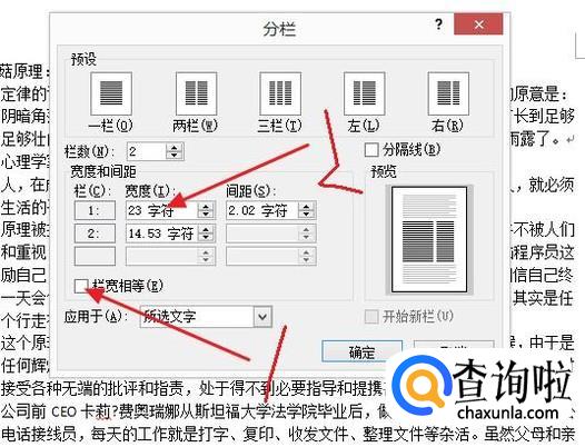 因为我们要的是分栏不均匀,所以把栏宽相等那里的打钩去掉,再调整宽度就可以了。然后点击确定。