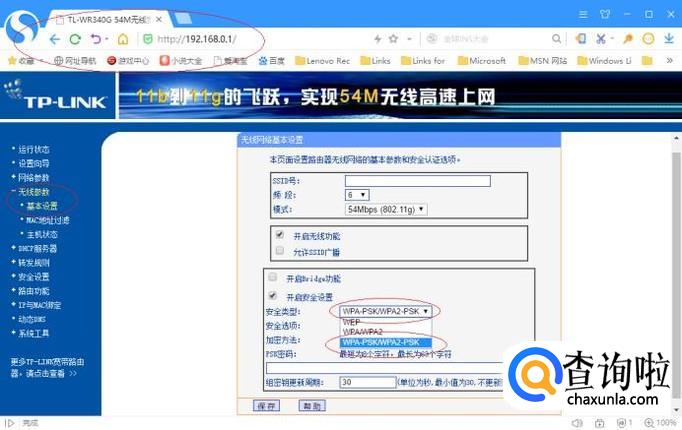 如图所示,点击"安全类型"文本框右侧向下箭头。弹出下拉列表选项,选择"WPA-PSK/WPA2-PSK"项。