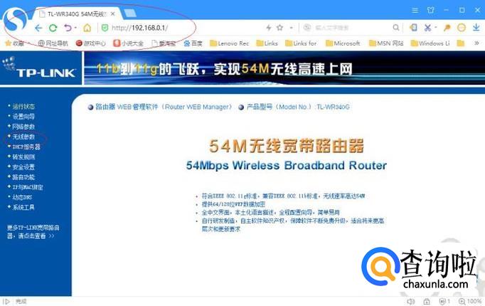 如图所示,唤出无线路由器WEB管理页面。默认显示无线路由器运行状态,选择左侧"无线参数"项。