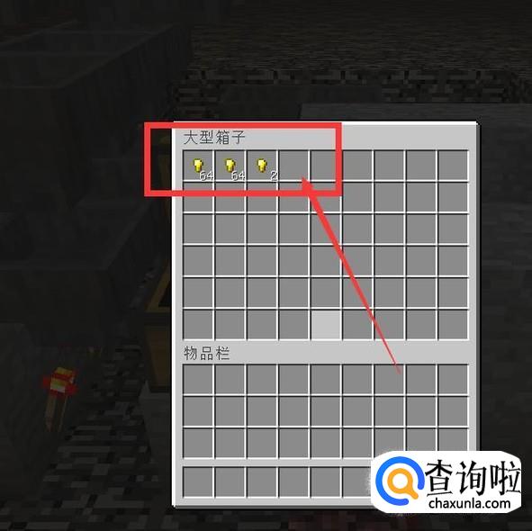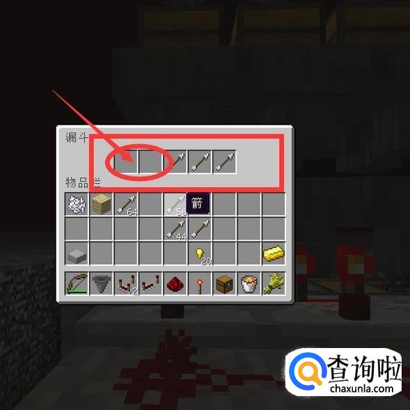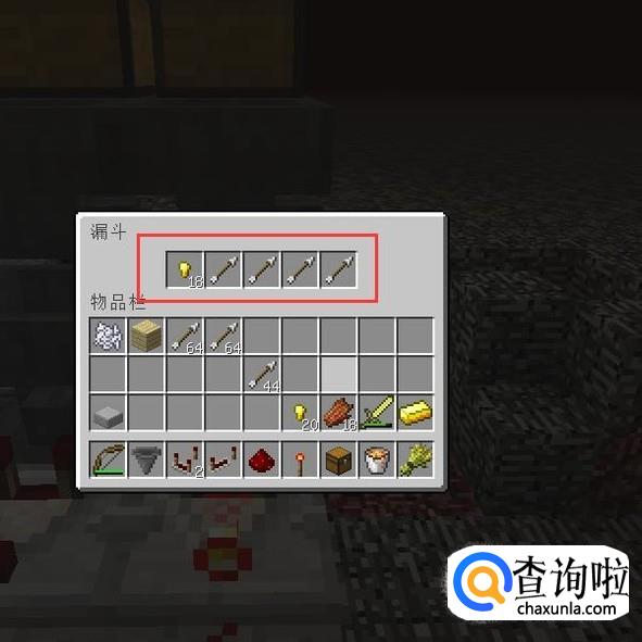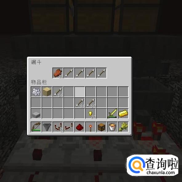 然后在第二排的漏斗里面,正对着箱子的那个漏斗里面放入4个任意物品,最后一格放18个金粒(不建议放箭,我当时做的时候身上只有箭。)
