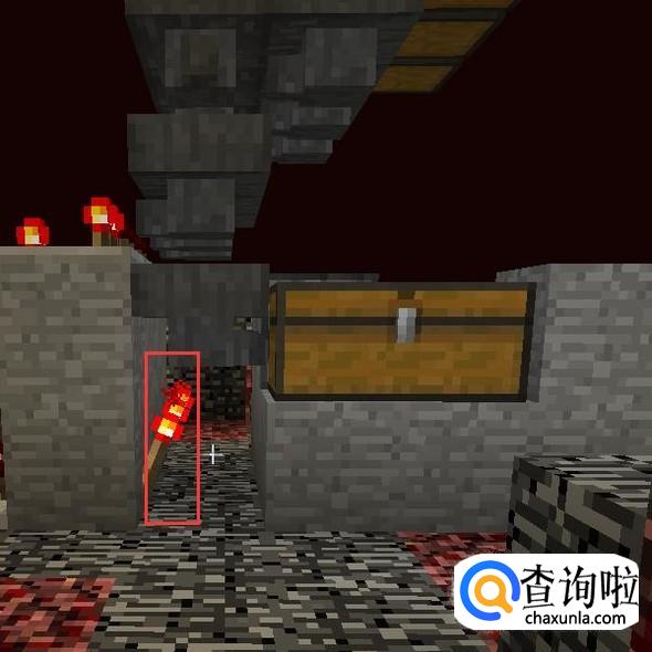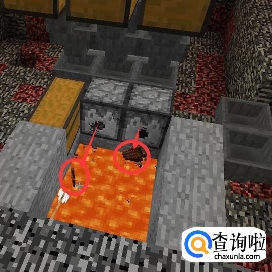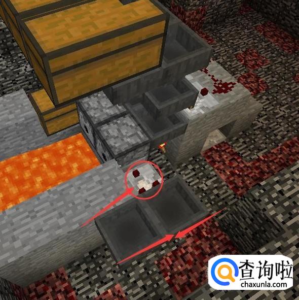 用石头将发射器的前方挡住,并且挖一个2X3的区域,倒入岩浆。