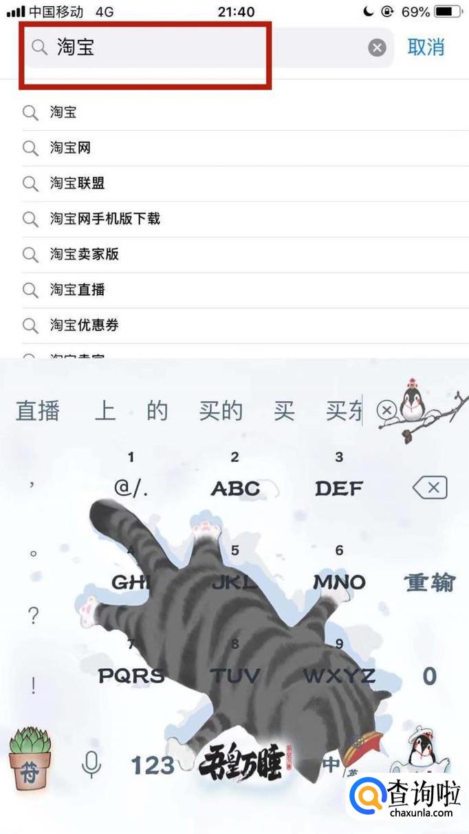 然后输入淘宝并点击搜索,如下图所示。