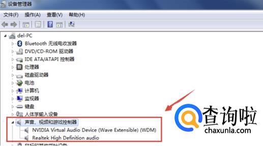 这里就是检查音频驱动了,点击下图中选中的部分,就能查看相应的驱动是否有感叹号之类的符号,如果有,就要重装驱动,然后重启即可解决问题。