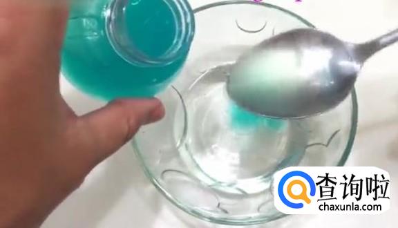 我们以勺子为计量单位,我们先取一勺洗衣液和三勺水放入准备好的玻璃杯中,这个浓度一定要调好,这一步最关键。