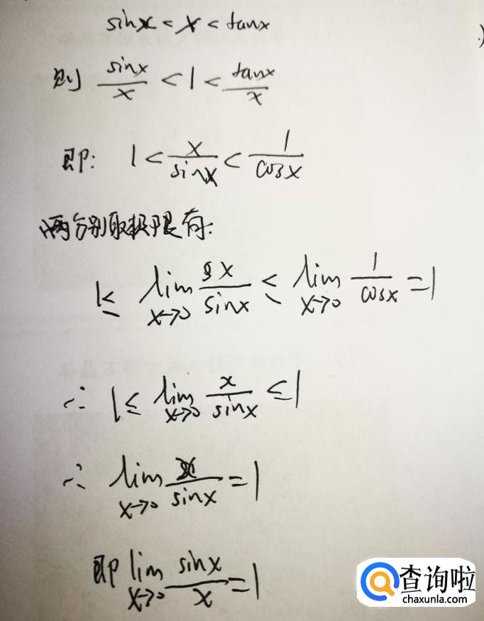 这样就有如下的不等关系。据此推出x/sinx在x趋于0的极限。