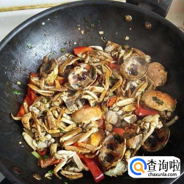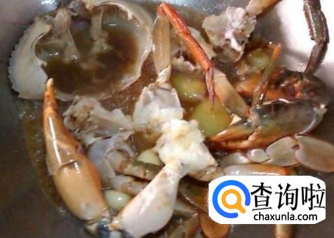 翻炒至7分熟后,加入少量的水,水不要没过螃蟹,煮至沸腾后将耗油和酱油倒入,再接着煮。
