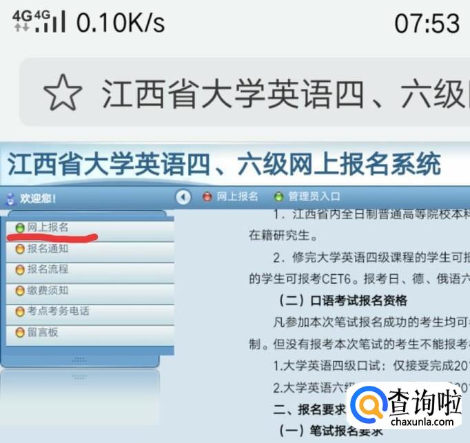 进入报名链接后,点击界面左边的"网上报名",完成相关步骤就可以在网上报名四级了。