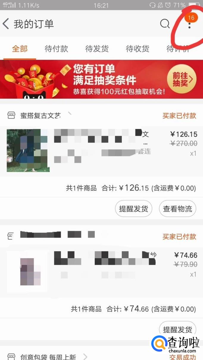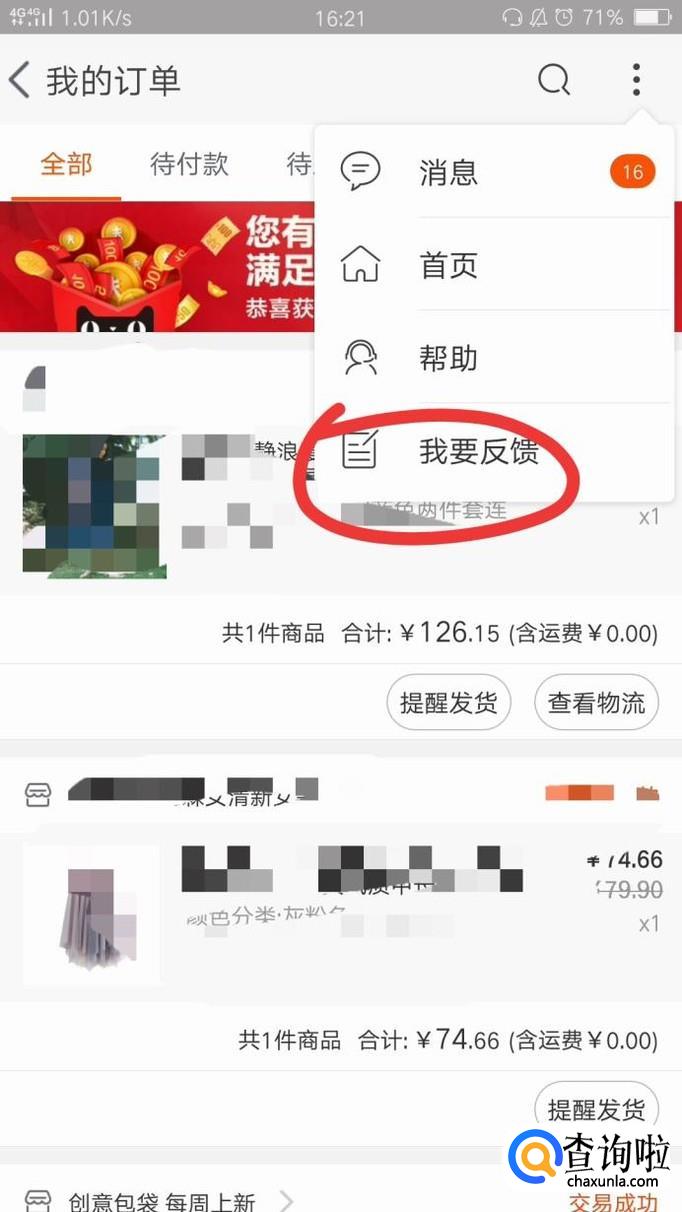 进入淘宝后,点击界面左下角的"我的",进入"我的订单",然后点击界面右上角红色圈圈里面的符号,在弹出来的选项中选择"我要反馈"。