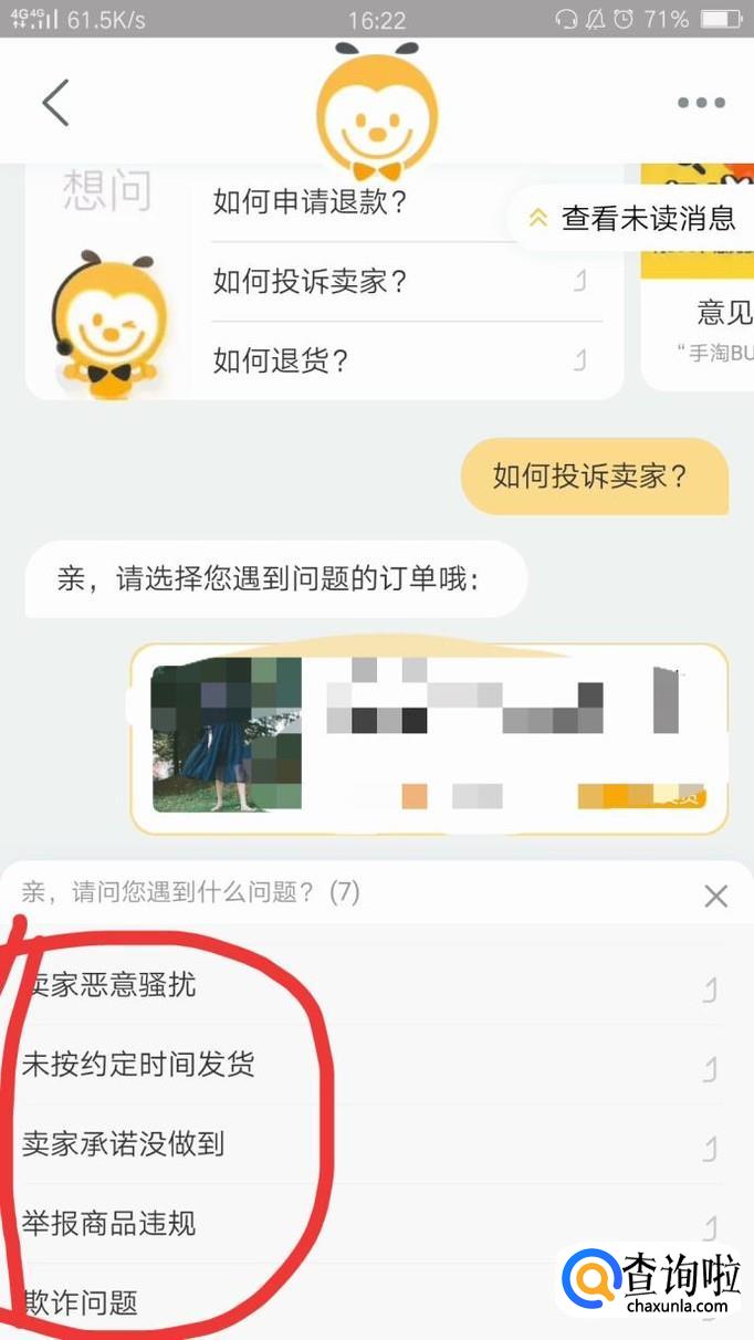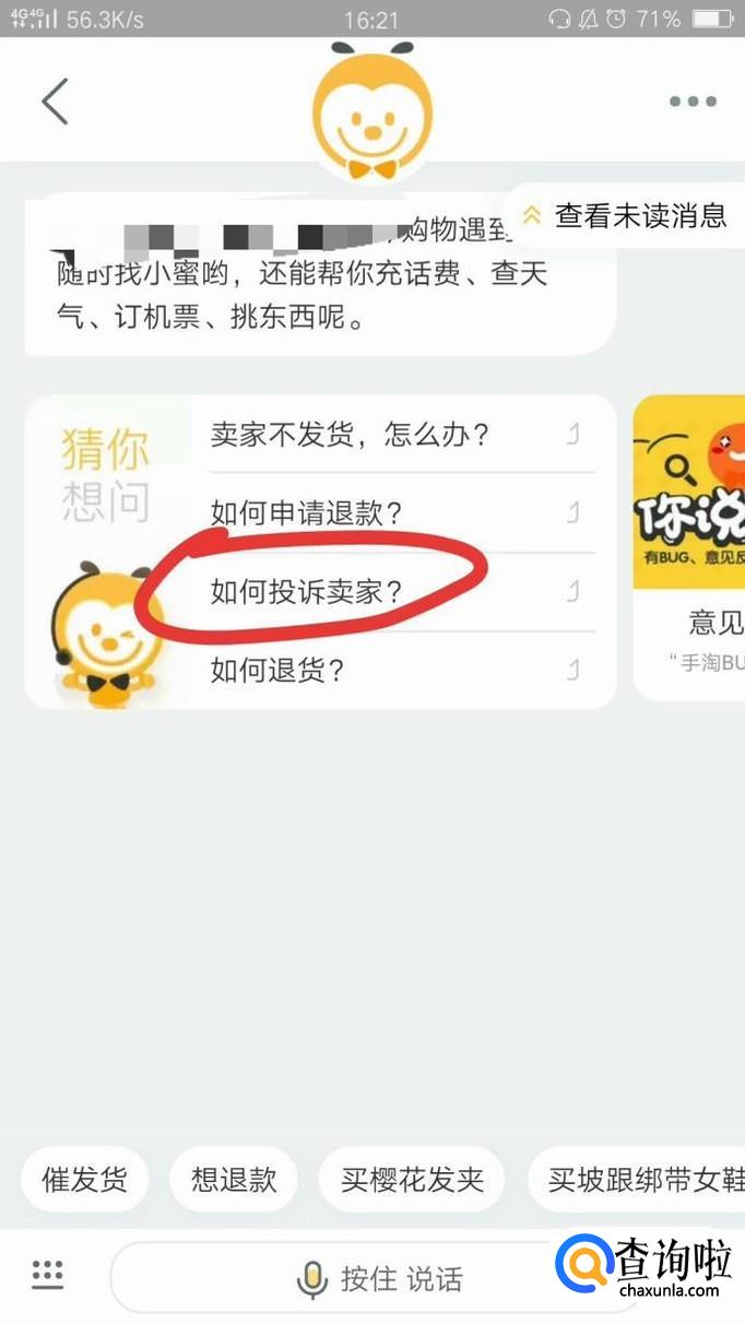 在对话框里点击"如何投诉商家"。
