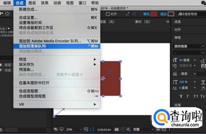 动效视频绘制完成之后,在上方菜单中点击“合成-添加到渲染队列”