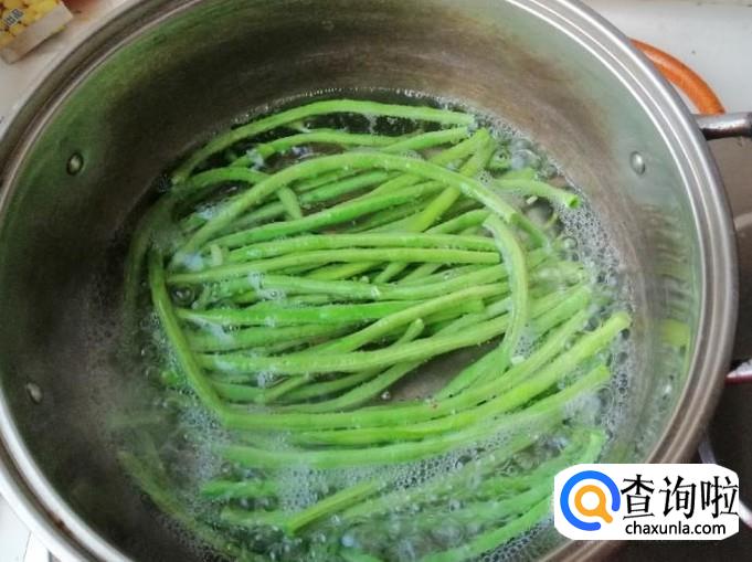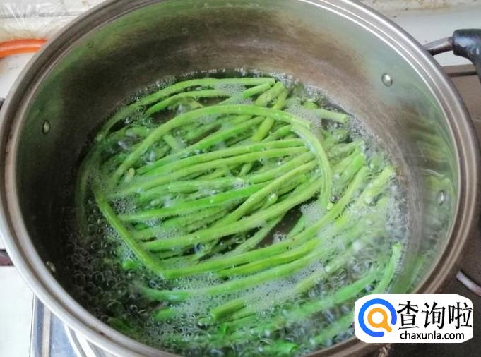煮好木耳后把锅里水倒掉,刷锅添水准备烫豆角。同样适量水烧开后放入洗好的长豆角,加少许盐煮出来的菜不大变色,我选很嫩的豆角两三分钟就好了,豆角老的话可以关火后加锅盖再闷一会。