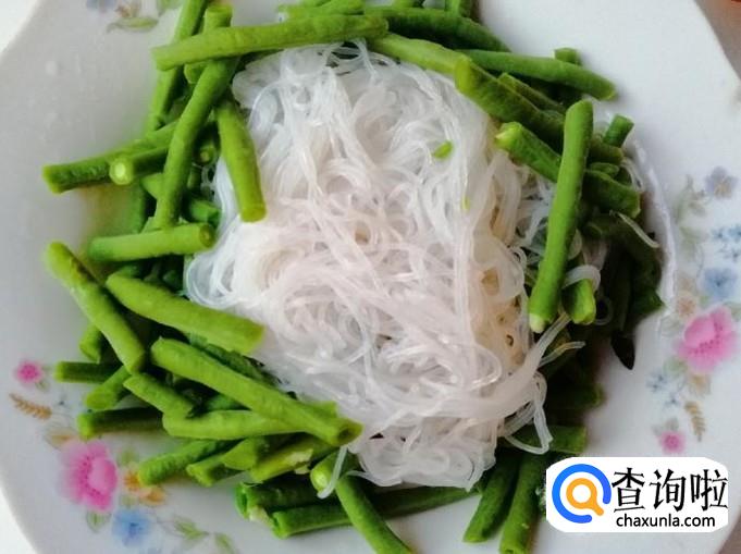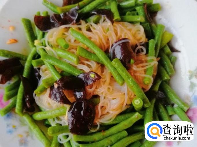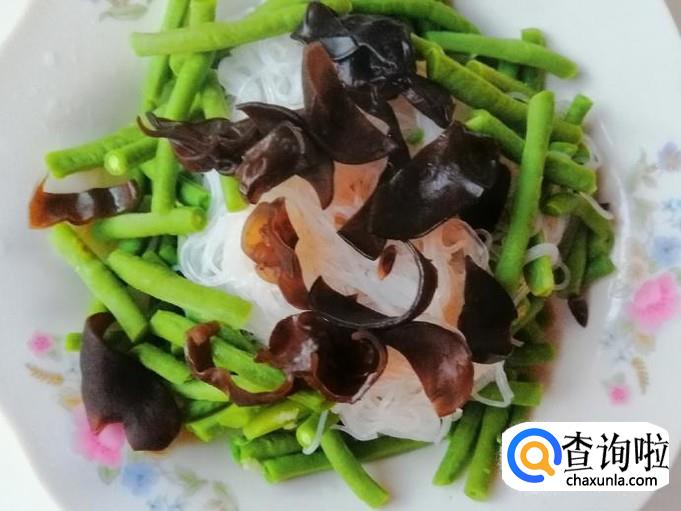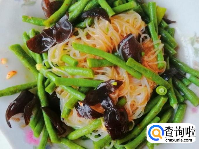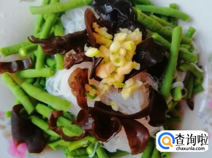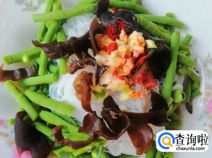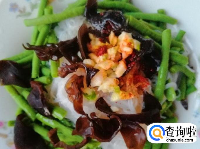 长豆角一小把、水发木耳适量、粉丝适量、凉拌蒜、一小勺辣椒面、醋、生抽少许。