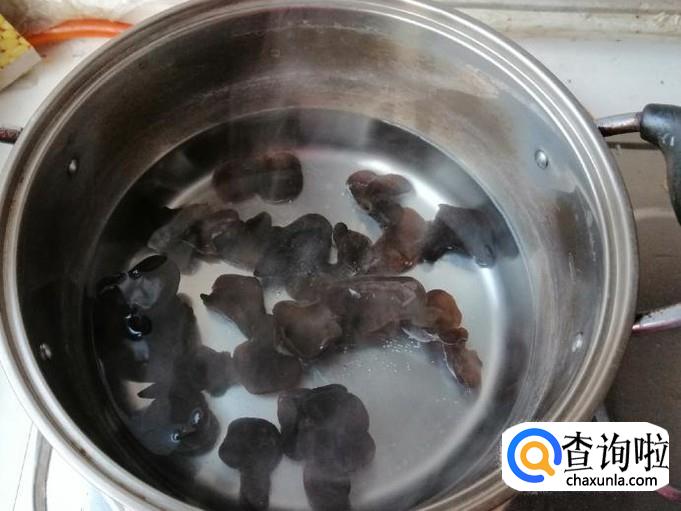 这个菜里面要用到木耳,所以木耳提前两小时泡好,摘洗干净备用。我这盘子有现泡好的,用煮锅烧水煮一下,大约3-5分钟就行。因为一会直接凉拌,必须把泡好的木耳煮一下待用。