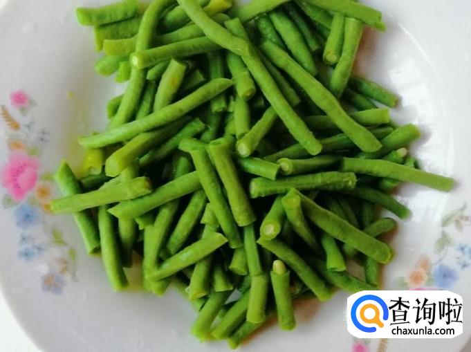 把刚才烫好的豆角放置晾会自然冷却就好,以不烫手为原则,放入案板切成一寸左右的豆角段,装入盘中。不要用凉水过,因为我们选择凉拌吃,再过生水的话怕有肠胃不好的吃了再引起不适。