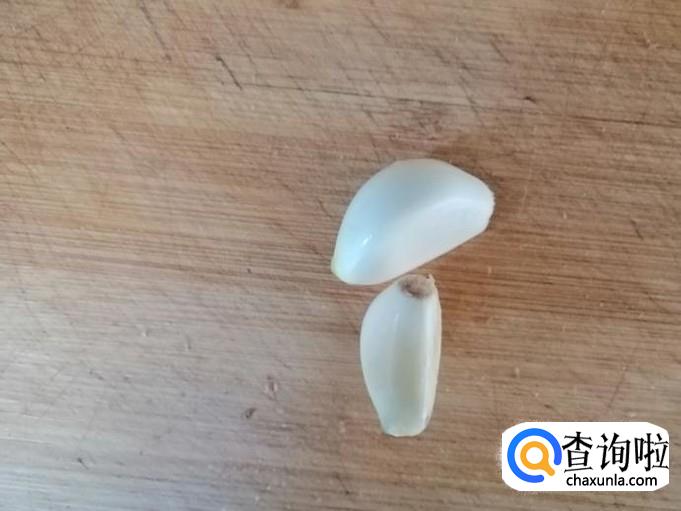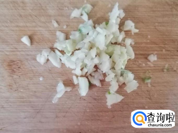取适量蒜剥好两瓣待用,洗净用刀切掉两头,用刀背拍扁,然后再剁碎一会准备再用。蒜量根据自己喜好来定,喜欢就多放点,这主意要是提味。