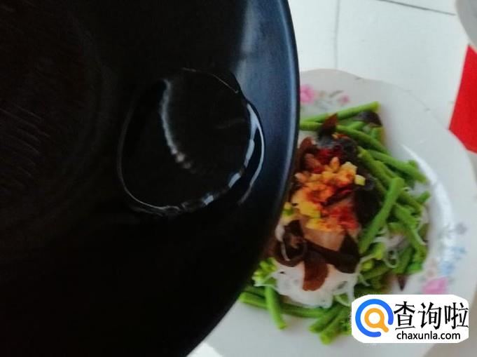 炒锅放适量食盐用油,点火油热后用来泼在辣椒面和蒜末上,这个油温要高些,看见油锅冒烟就可以直接关火,油趁热泼菜上,浇上热油后就闻见香味了,加适量醋、生抽搅拌均匀就好。这样我们好吃的油泼辣子豆角木耳拌粉丝就做好了。