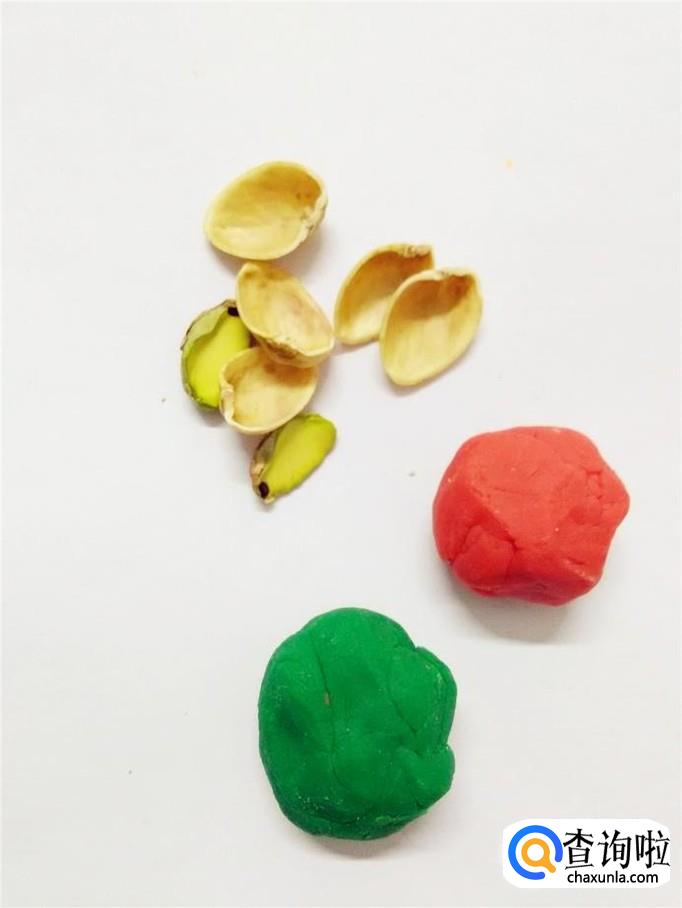 吃开心果时,留一个开心果的仁,其余可以吃掉,把壳留着,再准备红和绿两种颜色的彩泥。