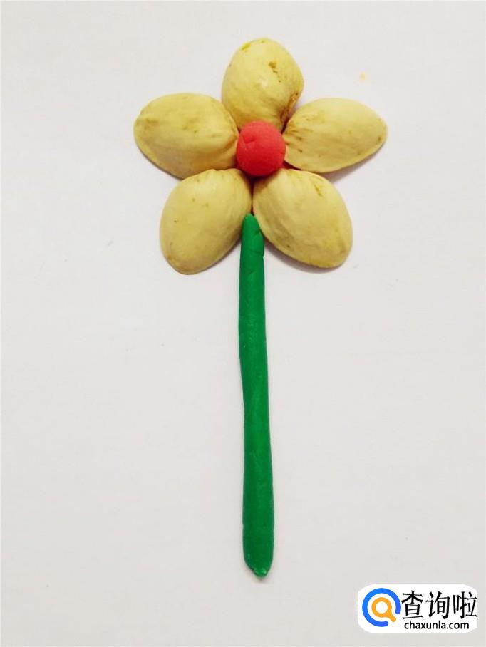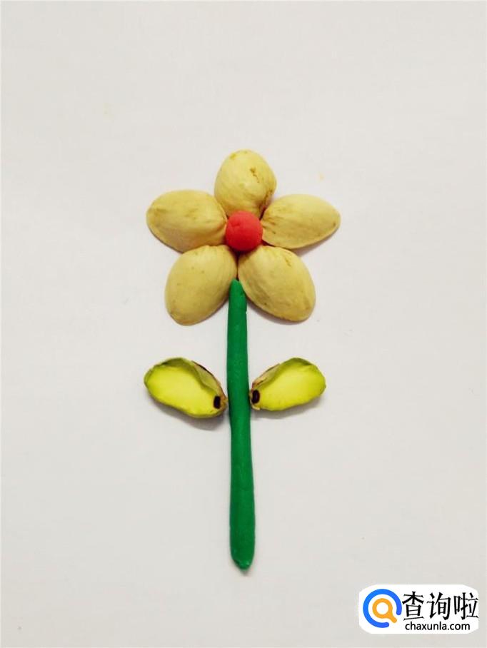 把两瓣开心果仁放在绿色的花茎两侧,一朵漂亮的花就做完了。