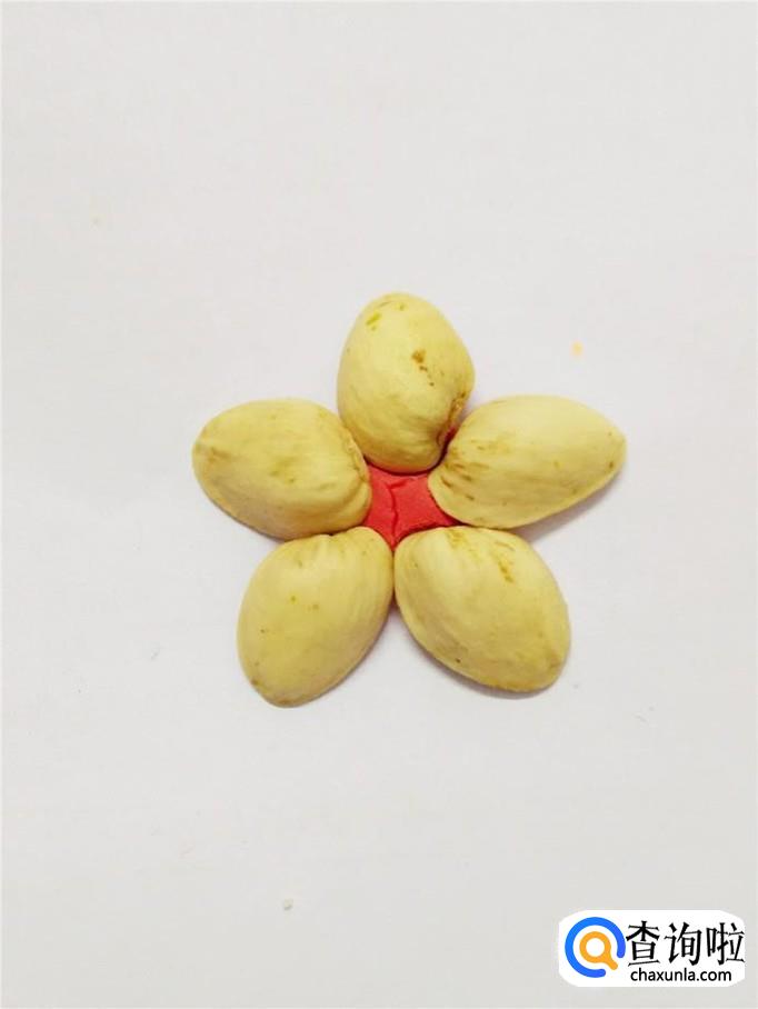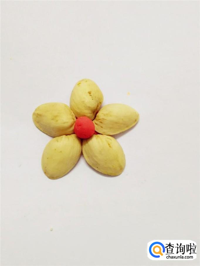 把五瓣开心果壳均匀地按在红色的彩泥圆片上,组成一朵花的形状。