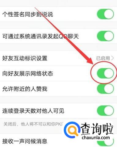 进入之后,将图示位置的“向好友展示网络状态”关闭即可取消手机QQ在线显示的手机型号,如图所示。