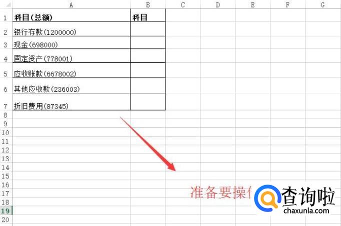 首先我们打开Excel软件,准备一个科目数据表,如下图所示,科目和金额在一起
