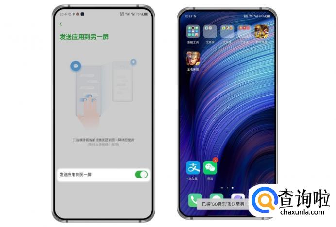 打开此选项,在任意应用界面三指向左或向右滑动即可将应用发送到另外一个屏幕上(PS:这里上下滑动是不可以的)。使用此功能还是比较推荐打开自动翻转屏幕的选项,可以更加快捷的操作,聊完这面屏幕聊另外一面屏幕,只需要轻轻翻转即可完成复杂操作。