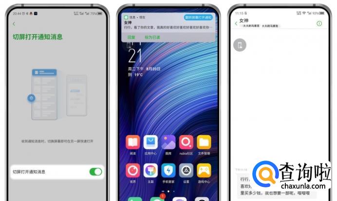 收到横幅消息通知翻转手机即可进入消息界面。使用此功能前推荐在设置-双屏切换-切换方式中选择自动翻转切屏,并勾选悬浮按钮锁定功能,会让操作更佳便捷。